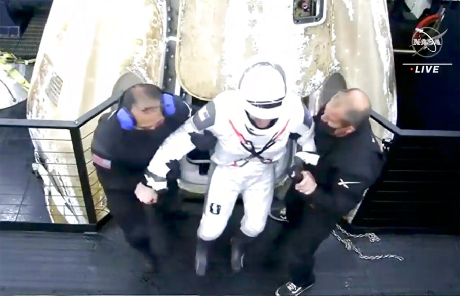 NASA astronaut Mike Hopkins is helped out of the SpaceX Crew Dragon Resilience spacecraft onboard the SpaceX GO Navigator recovery ship after he, NASA astronauts Mike Hopkins, Shannon Walker, and Japan Aerospace Exploration Agency (JAXA) astronaut Soichi Noguchi, landed in the Gulf of Mexico off the coast of Panama City, Florida, Sunday, May 2, 2021. NASA’s SpaceX Crew-1 mission was the first crew rotation flight of the SpaceX Crew Dragon spacecraft and Falcon 9 rocket with astronauts to the International Space Station as part of the agency’s Commercial Crew Program. (Bill Ingalls/NASA via AP)