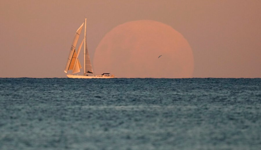 A yacht sails past as the moon rises in Sydney Wednesday, May 26, 2021. A total lunar eclipse, also known as a Super Blood Moon, will take place later tonight as the moon appears slightly reddish-orange in colour. (AP Photo/Mark Baker)