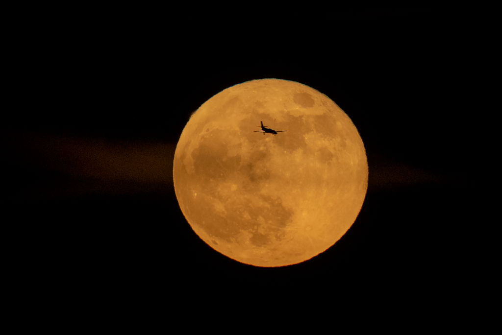 The silhouette of a plane is seen in front of the full moon on May 26, 2021 in Rome. (Photo by Tiziana FABI / AFP) (Photo by TIZIANA FABI/AFP via Getty Images)