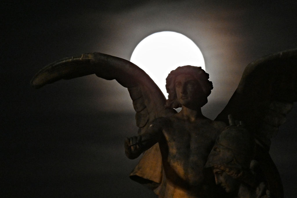 The “flowering full moon” rises behind one of the monuments of the Altare della Patria in Piazza Venezia, in Rome on 26 May 2021. (Photo by Andreas SOLARO / AFP) (Photo by ANDREAS SOLARO/AFP via Getty Images)