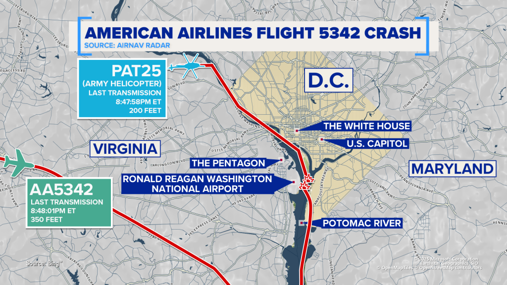 WASHINGTON (NewsNation) — The collision Wednesday night between a military helicopter and American Airlines Flight 5342 happened in some of the world’s most tightly controlled airspace, just over 3 miles south of the White House and the U.S. Capitol.