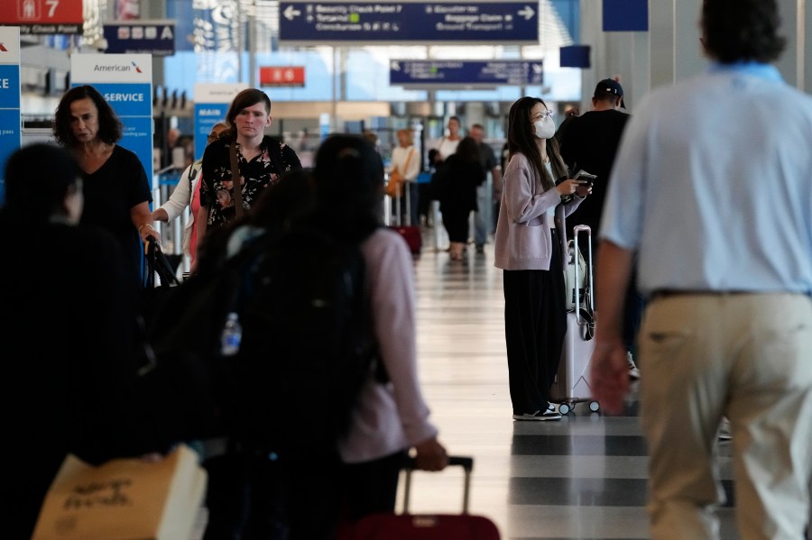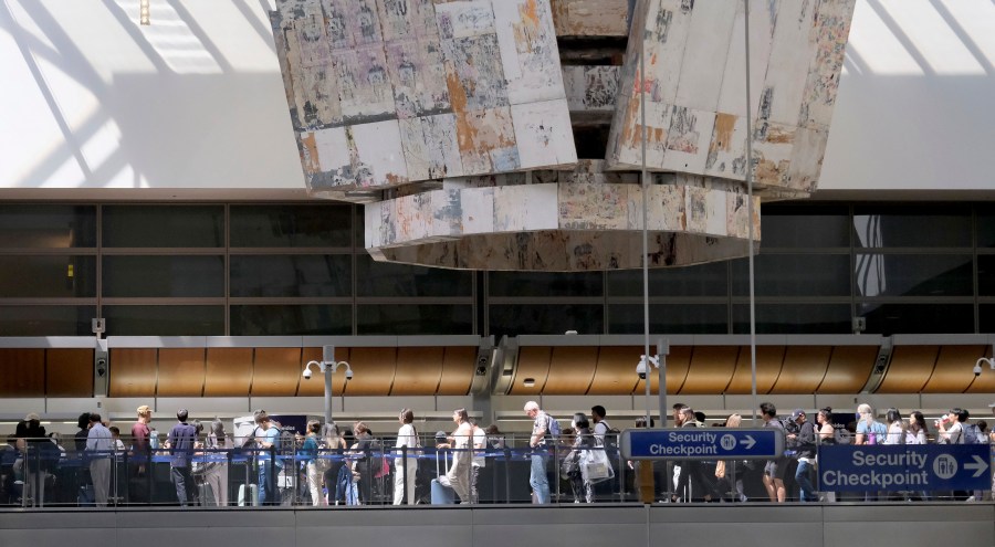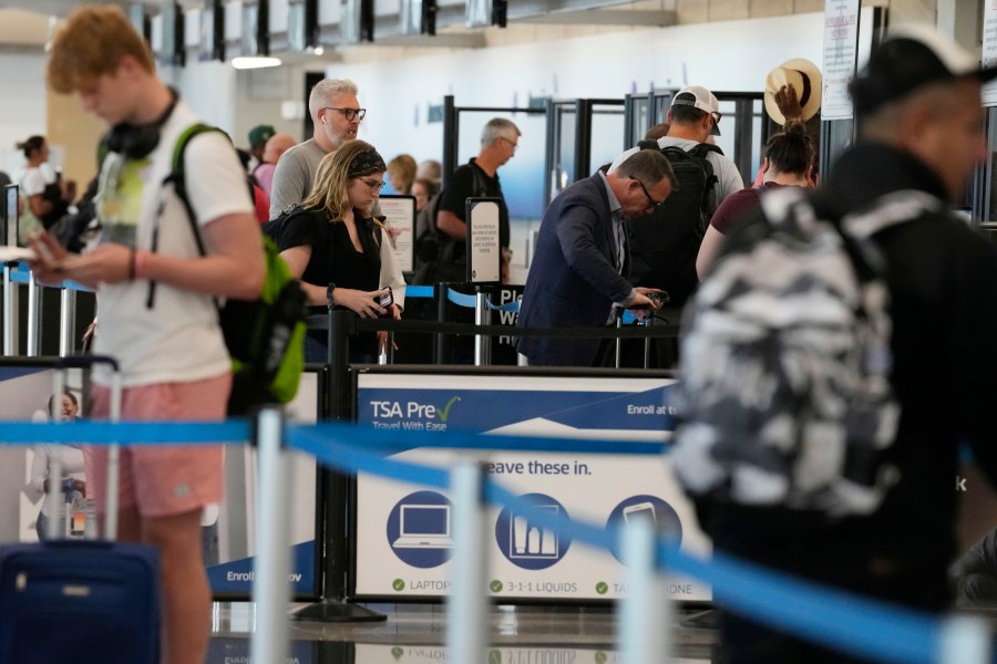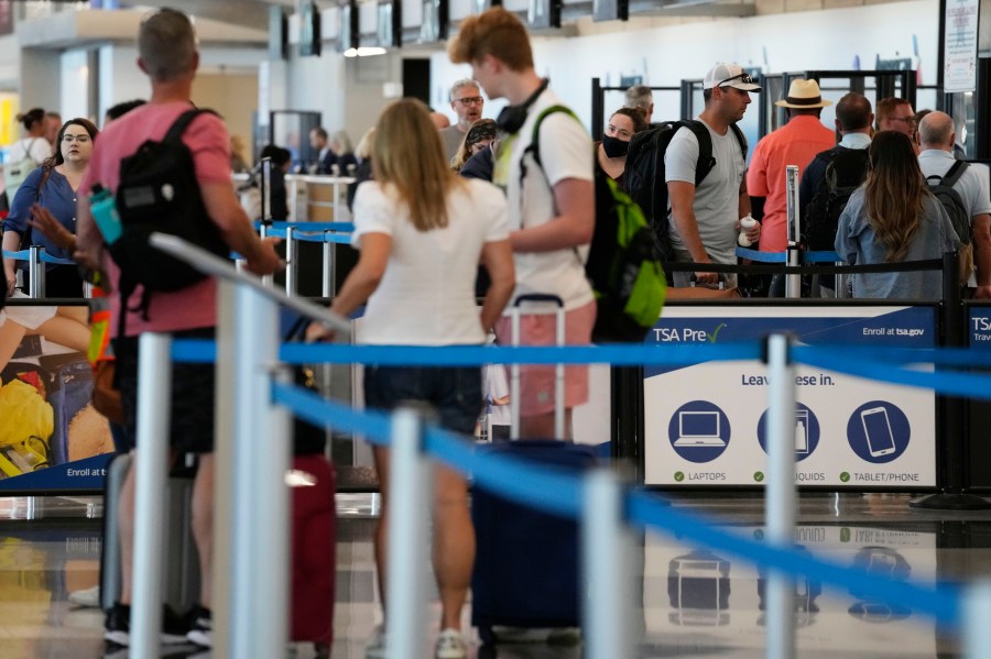 Travelers wait to go through security check point at O’Hare International Airport in Chicago, Thursday, Aug. 31, 2023. The Federal Aviation Administration predicts that this will be the third busiest holiday weekend of the year so far, behind only the Juneteenth weekend, which included Father’s Day, and the Presidents Day break.(AP Photo/Nam Y. Huh)