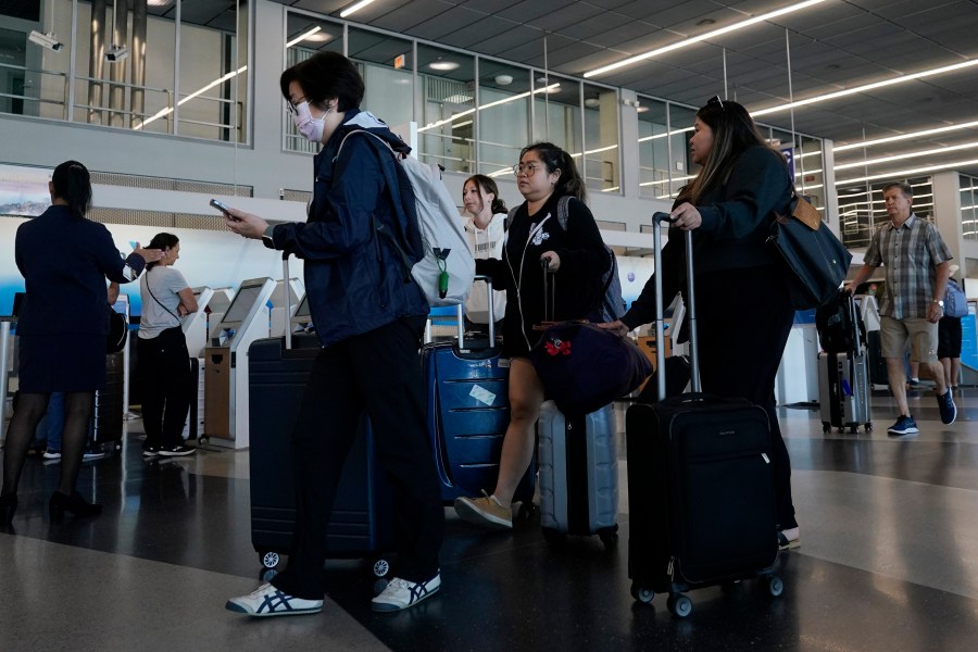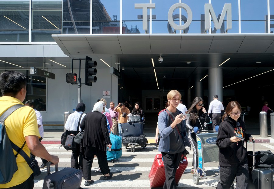 Travelers maneuver in and out of the Tom Bradley International Terminal at LAX on Wednesday, Aug. 30, 2023, in Los Angeles. With Labor Day weekend just days away, airports and roadways are expected to be busy as tens of thousands of Southern Californians travel out of town. (Dean Musgrove/The Orange County Register via AP)