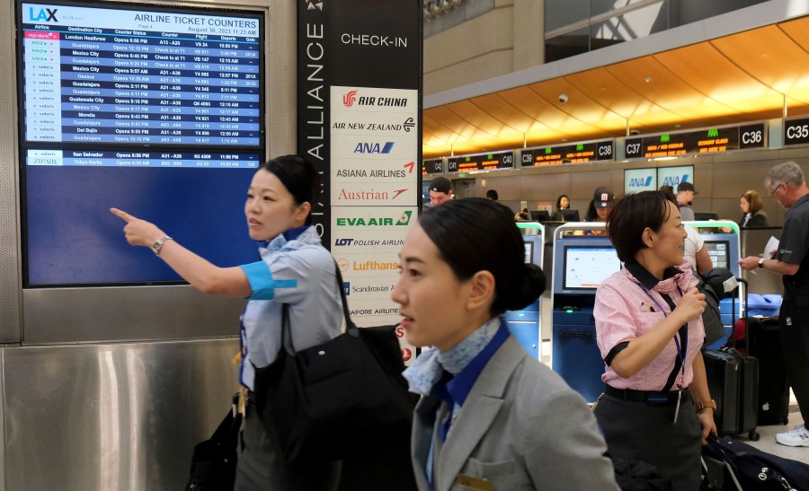 Flight attendants and travelers make their way through the Tom Bradley International Terminal at LAX on Wednesday, Aug. 30, 2023, in Los Angeles. With Labor Day weekend just days away, airports and roadways are expected to be busy as tens of thousands of Southern Californians travel out of town. (Dean Musgrove/The Orange County Register via AP)