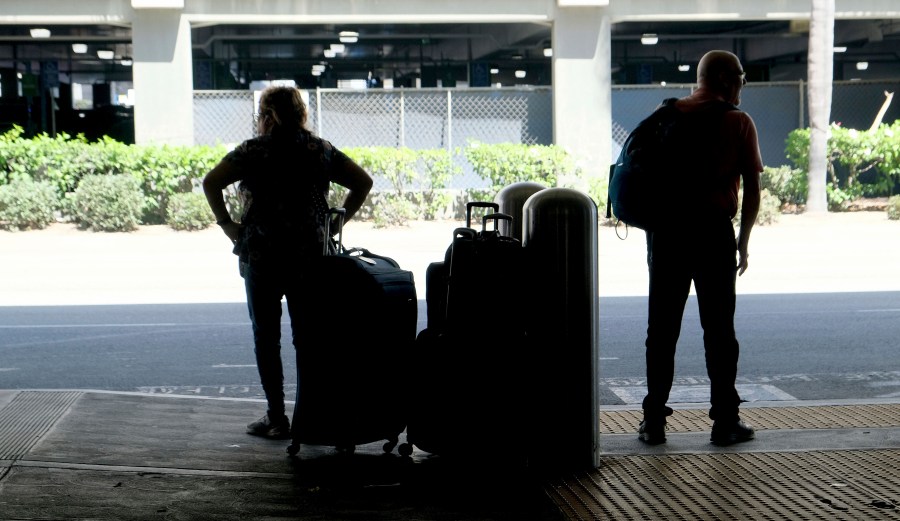 A couple waits for transportation at Terminal 5 at LAX on Wednesday, Aug. 30, 2023, in Los Angeles. With Labor Day weekend just days away, airports and roadways are expected to be busy as tens of thousands of Southern Californians travel out of town. (Dean Musgrove/The Orange County Register via AP)