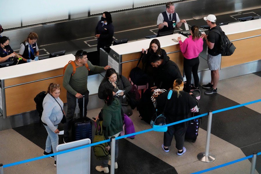 Travelers stand in line at the Tom Bradley International Terminal at LAX on Wednesday, Aug. 30, 2023, in Los Angeles. With Labor Day weekend just days away, airports and roadways are expected to be busy as tens of thousands of Southern Californians travel out of town. (Dean Musgrove/The Orange County Register via AP)