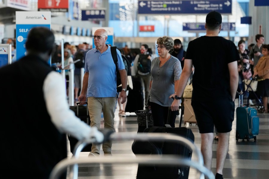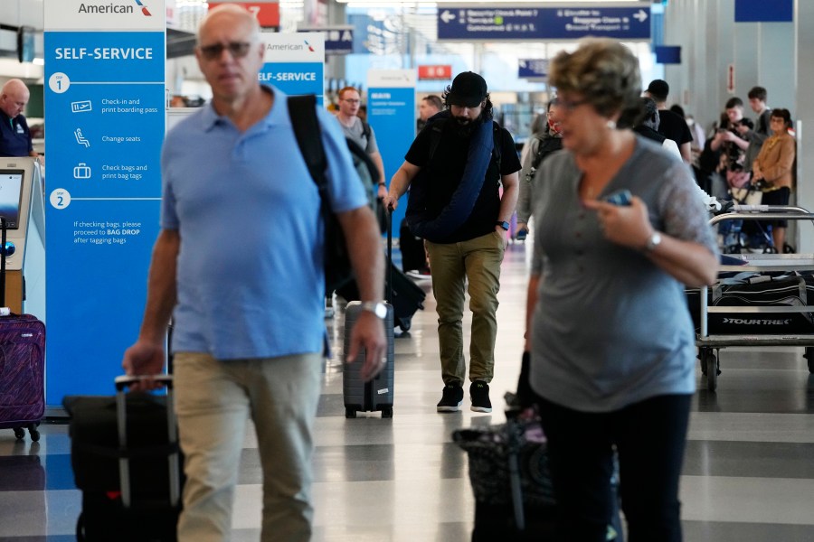 Travelers make their way toward Terminal 3 at O’Hare International Airport in Chicago, Thursday, Aug. 31, 2023. The Federal Aviation Administration predicts that this will be the third busiest holiday weekend of the year so far, behind only the Juneteenth weekend, which included Father’s Day, and the Presidents Day break.(AP Photo/Nam Y. Huh)