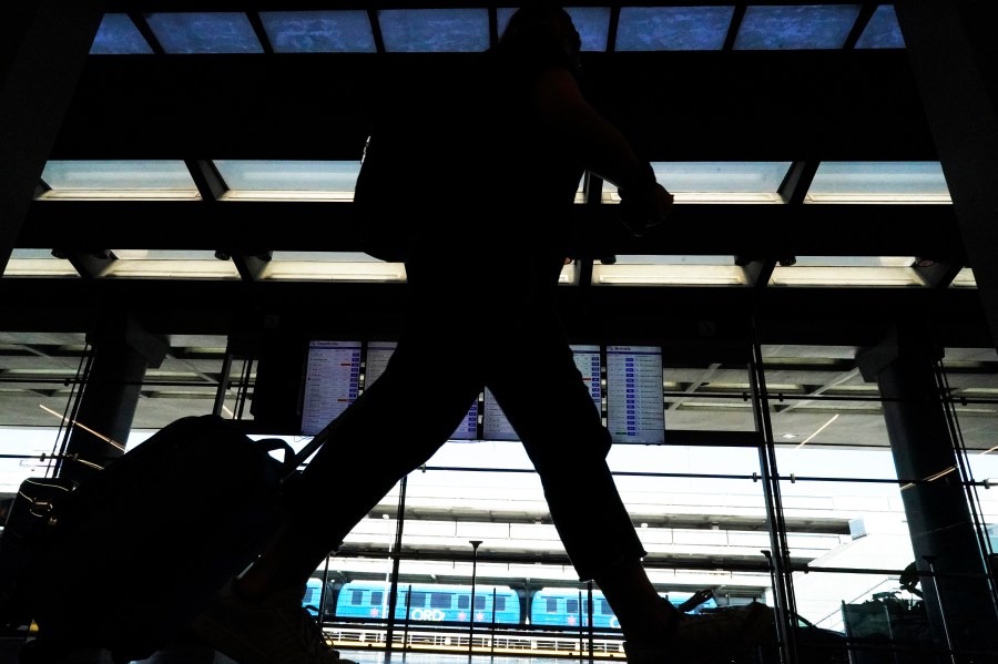 A traveler walks through Terminal 3 at O’Hare International Airport in Chicago, Thursday, Aug. 31, 2023. The Federal Aviation Administration predicts that this will be the third busiest holiday weekend of the year so far, behind only the Juneteenth weekend, which included Father’s Day, and the Presidents Day break.(AP Photo/Nam Y. Huh)