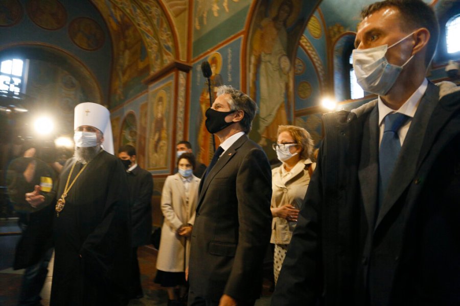 Earlier in the day, Blinken met with Kuleba, and they both joined Metropolitan Epiphaniy — head of the Ukrainian Orthodox Church, which split from Russia’s Orthodox Church. They laid flowers at a memorial to Ukrainian soldiers killed in the conflict in the east of the country and toured St. Michael’s Monastery.