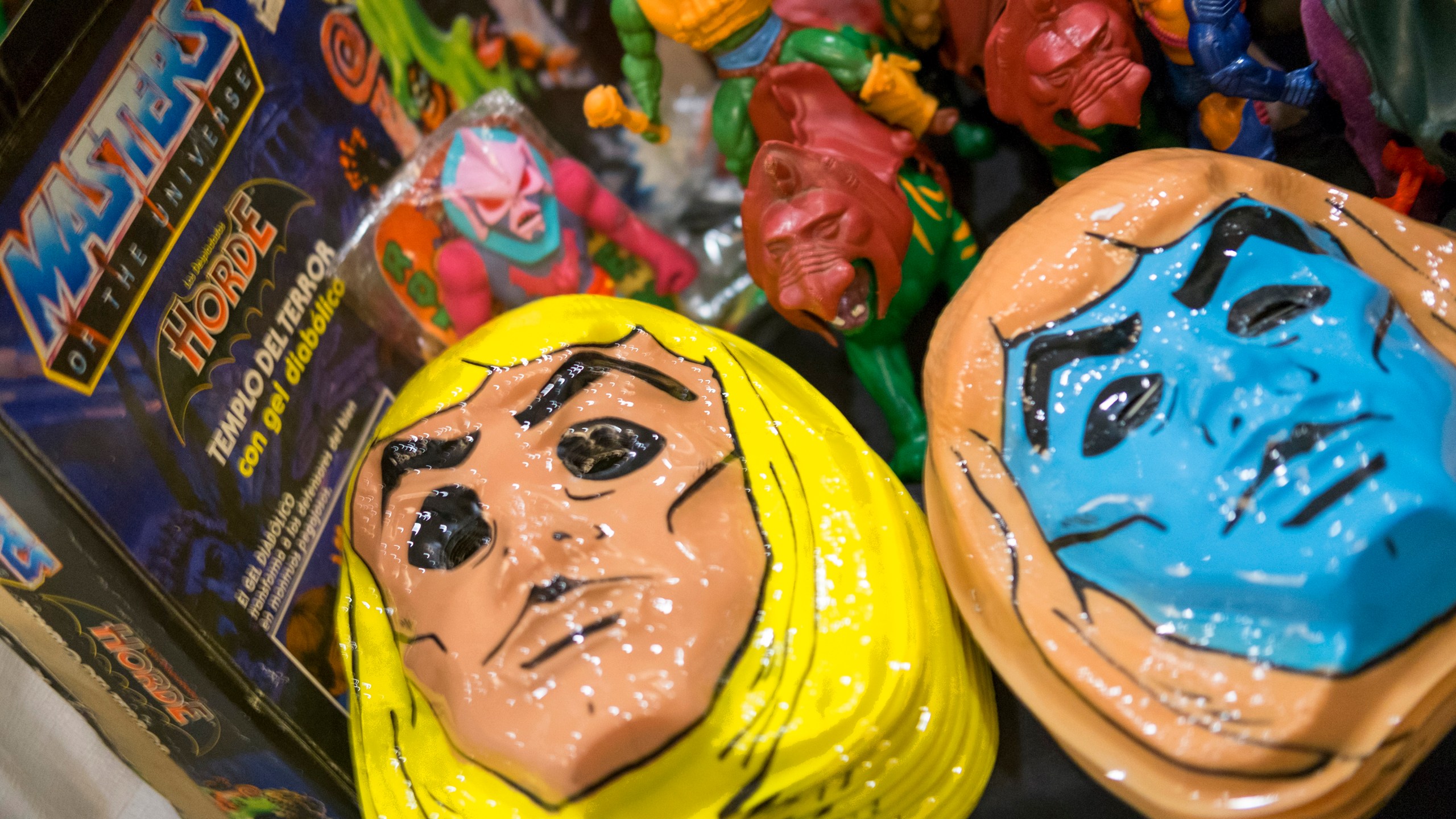 Vintage He-Man masks on display during Power-Con 2019 at Hilton Anaheim on August 18, 2019 in Anaheim, California. The toys have value again as a new “Masters of the Universe” series debuts on Netflix. (Photo by Angela Papuga/Getty Images)