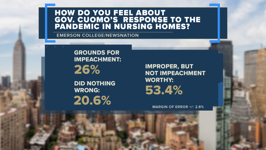 According to the poll, 53% of New York City voters believe Cuomo’s response to the pandemic in nursing homes was improper but not to the level of impeachment. Additionally, 21% believe he did nothing wrong as compared to 26% who view his actions as grounds for impeachment.