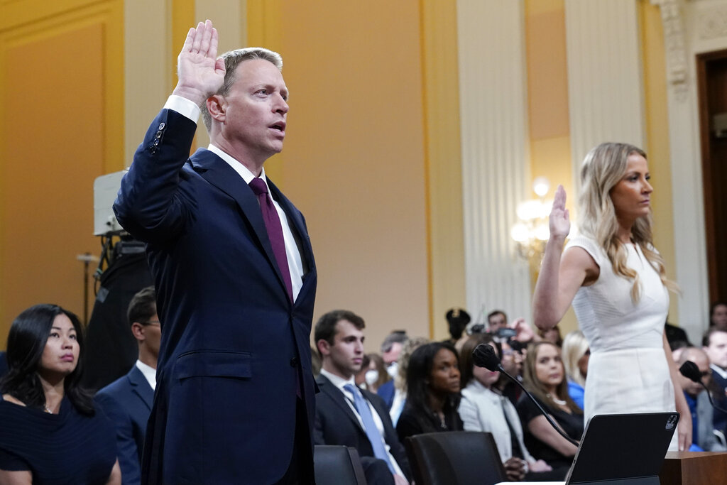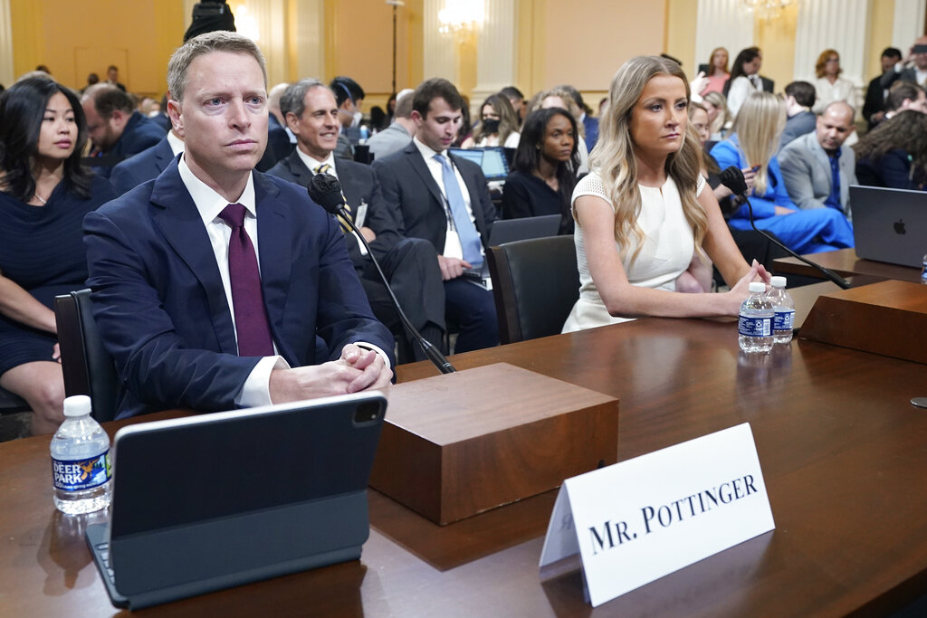 Testifying Thursday are former White House aides. Matt Pottinger, who was deputy national security adviser, and Sarah Matthews, then press aide, both submitted their resignations on Jan. 6, 2021, after what they saw that day. Trump has dismissed the hearings on social media and regarded much of the testimony as fake.