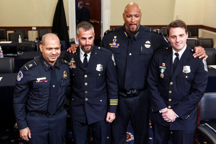 In this July 27, 2021 photo, from left, U.S. Capitol Police Sgt. Aquilino Gonell, Washington Metropolitan Police Department officer Michael Fanone, U.S. Capitol Police Sgt. Harry Dunn and Washington Metropolitan Police Department officer Daniel Hodges pose for a photo after a House select committee hearing on the Jan. 6 attack on Capitol Hill in Washington. The Senate has voted to award Medals of Honor to the Capitol Police and the Metropolitan Police Department for protecting Congress during the Jan. 6 insurrection, sending the legislation to President Joe Biden for his signature.  The bill passed by voice vote with no objections. The four medals will be displayed at Capitol Police headquarters, the Metropolitan Police Department, the U.S. Capitol and the Smithsonian Institution. (Oliver Contreras/The New York Times via AP, Pool)