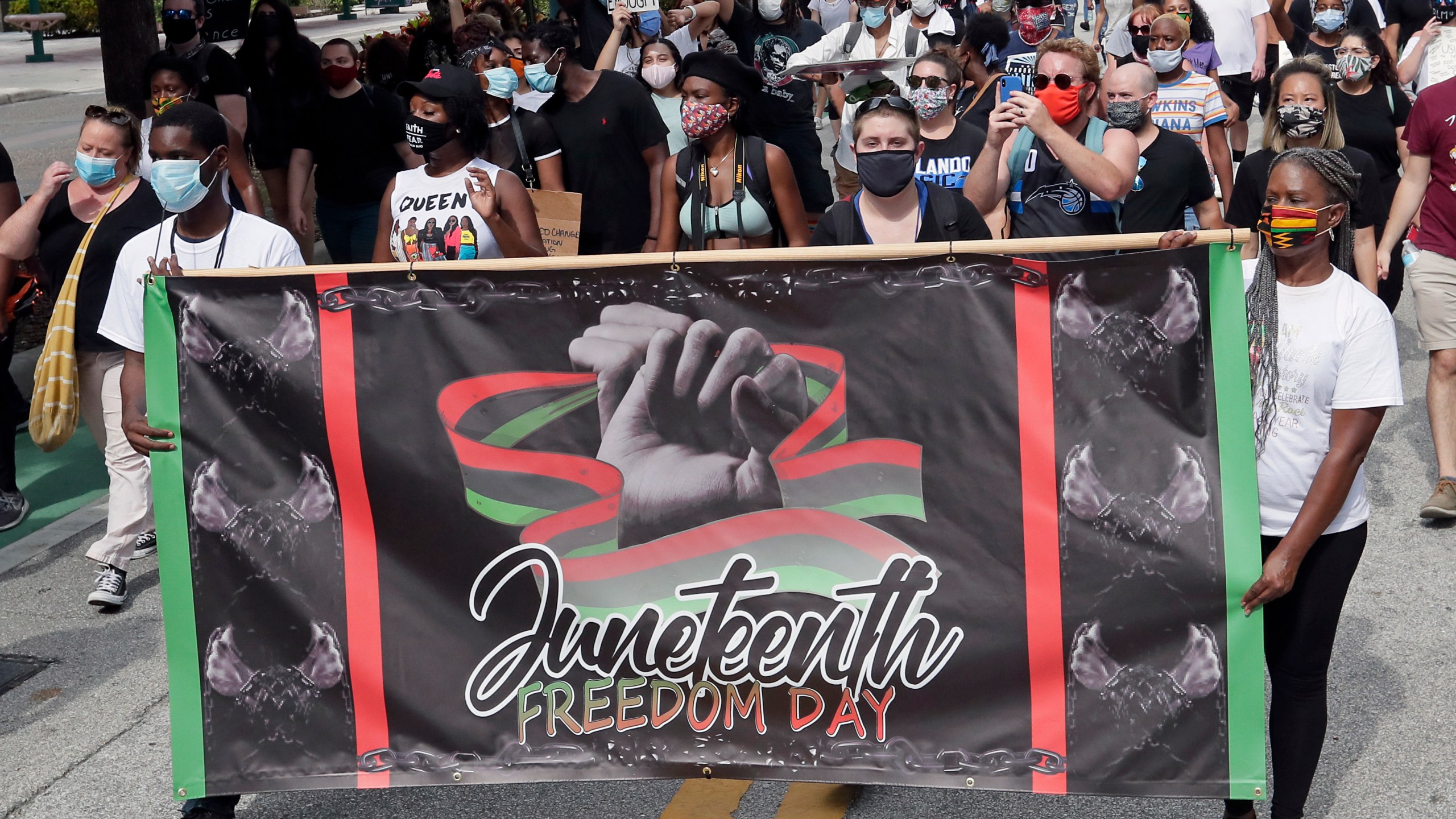 FILE – In this June 19, 2020, file photo, demonstrators march through downtown Orlando, Fla., during a Juneteenth event. Congress and President Joe Biden acted with unusual swiftness Thursday, June 17, 2021, in approving Juneteenth as a national holiday. That sent many states scrambling to clarify their policies on the celebration of slavery’s end. This year alone, Juneteenth bills hit roadblocks in Florida, Maryland, Ohio and South Dakota. (AP Photo/John Raoux, File)