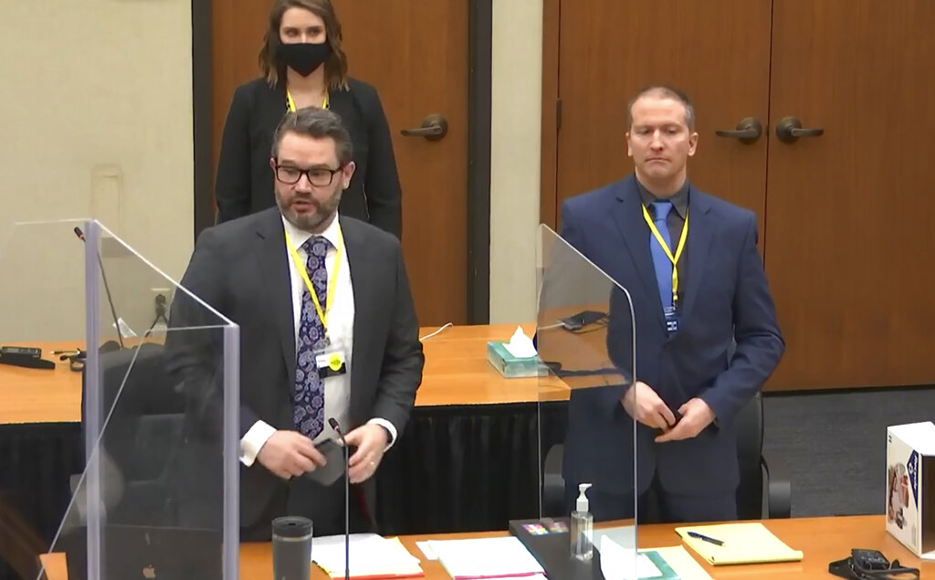 In this image taken from video, defense attorney Eric Nelson, left, and defendant former Minneapolis police officer Derek Chauvin, right, and Nelson’s assistant Amy Voss, back, introduce themselves to potential jurors as Hennepin County Judge Peter Cahill presides, prior to continuing jury selection, Monday, March 15, 2021, in the trial of Chauvin, at the Hennepin County Courthouse in Minneapolis, Minn. Chauvin is charged in the May 25, 2020, death of George Floyd. (Court TV, Pool via AP)