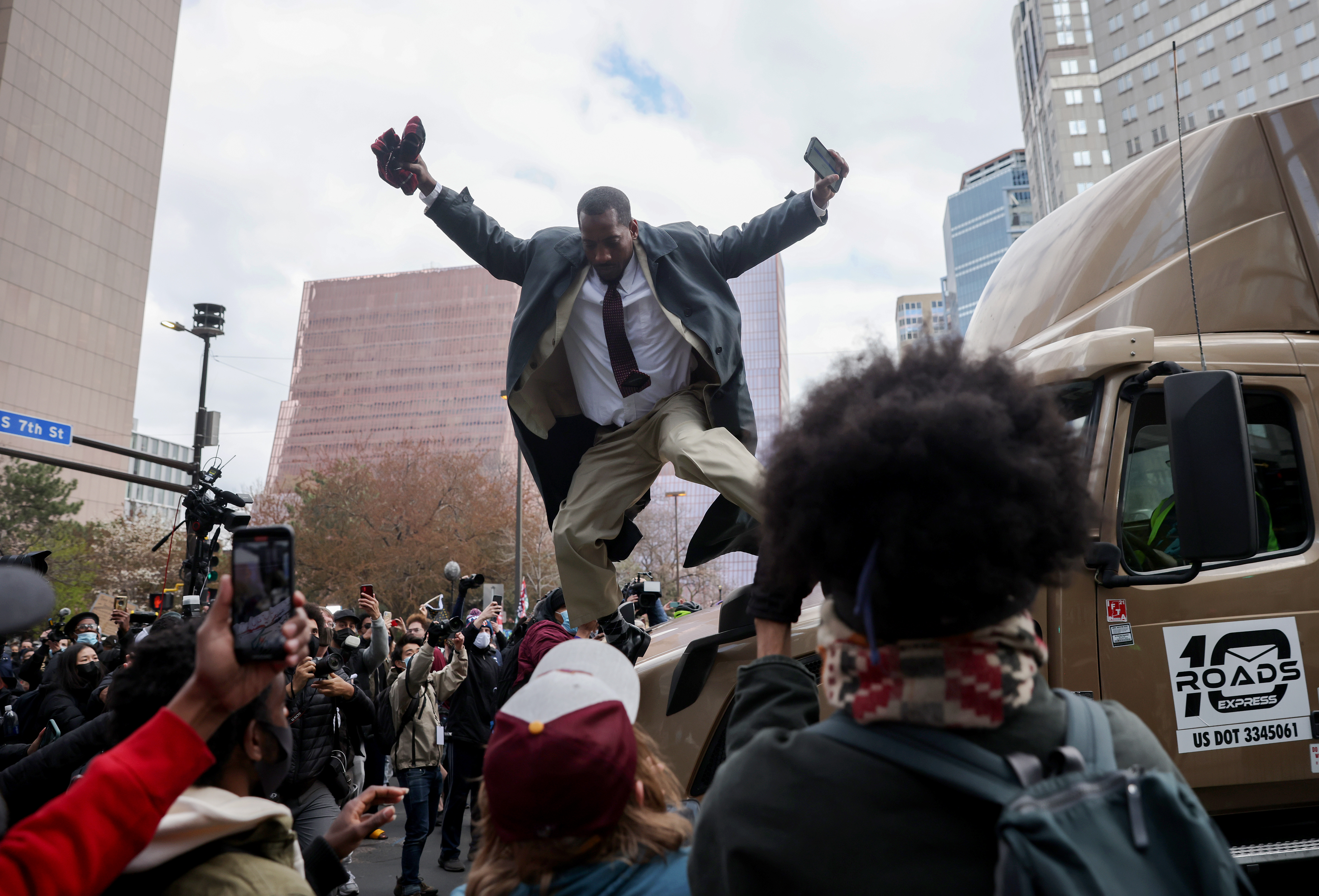 Protesters jumped on and surrounded a semi-truck after it drove near a crowd of people celebrating the guilty verdict.