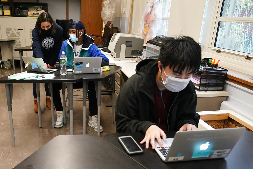 FILE – In this Oct. 29, 2020, file photo, student Tai Nguyen, right, works on his laptop as instructor Chaya Baras, left, helps student Kenny Scottborough, 19, navigate an online lesson at West Brooklyn Community High School in New York. New York City is shuttering schools to try to stop the renewed spread of the coronavirus, Mayor Bill de Blasio said Wednesday, Nov. 18, 2020, in a painful about-face for one of the first big U.S. school systems to bring students back to classrooms in the fall. (AP Photo/Kathy Willens, File)