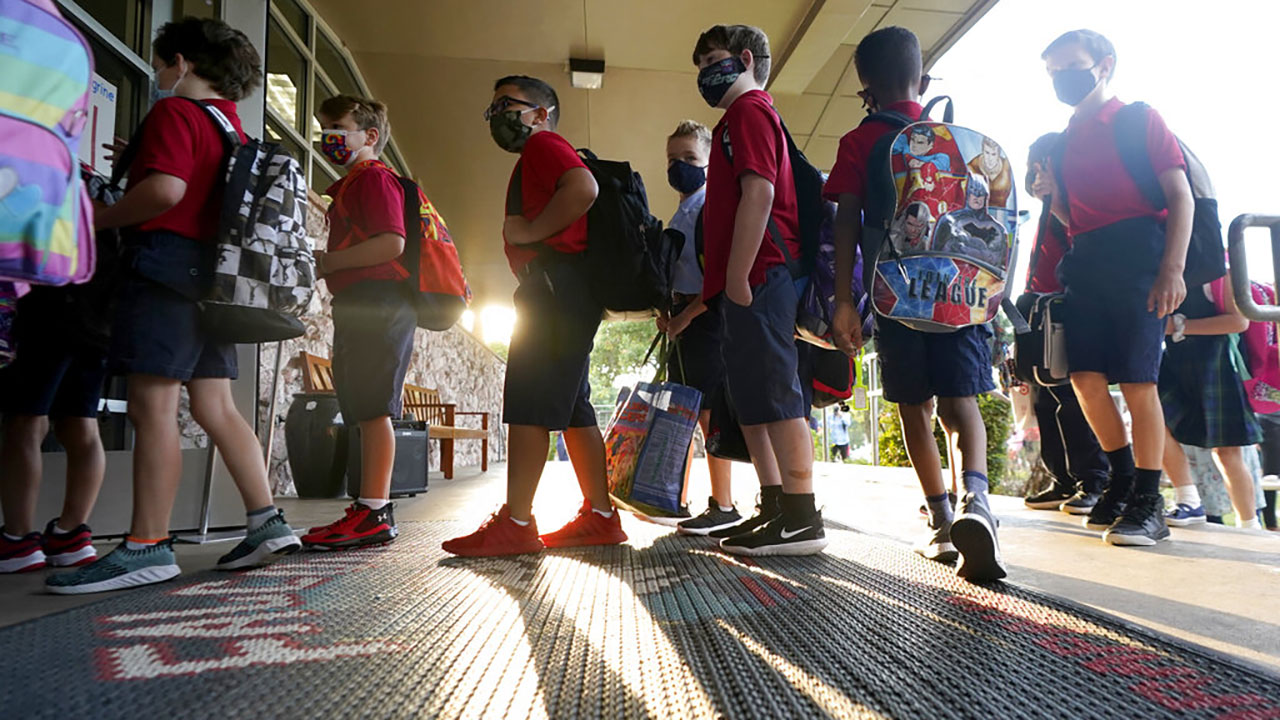 BOSTON (AP) — As COVID-19 cases surge around the country, a majority of Americans say they support mask mandates for students and teachers in K-12 schools, according to a new poll, but their views are sharply divided along political lines.