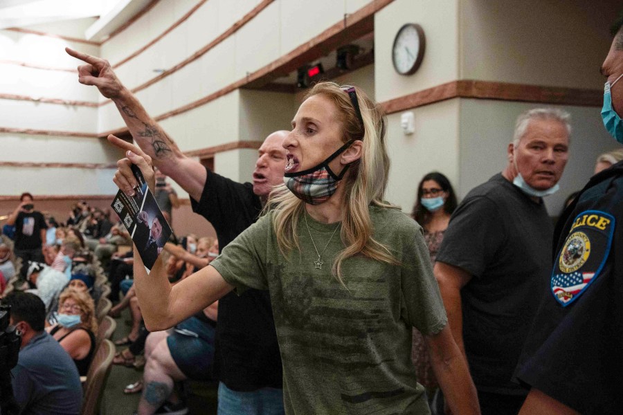 FILE – In this Aug. 12, 2021, file photo, protesters against a COVID-19 mandate gesture as they are escorted out of the Clark County School Board meeting at the Clark County Government Center, in Las Vegas. (Bizuayehu Tesfaye/Las Vegas Review-Journal via AP, File)