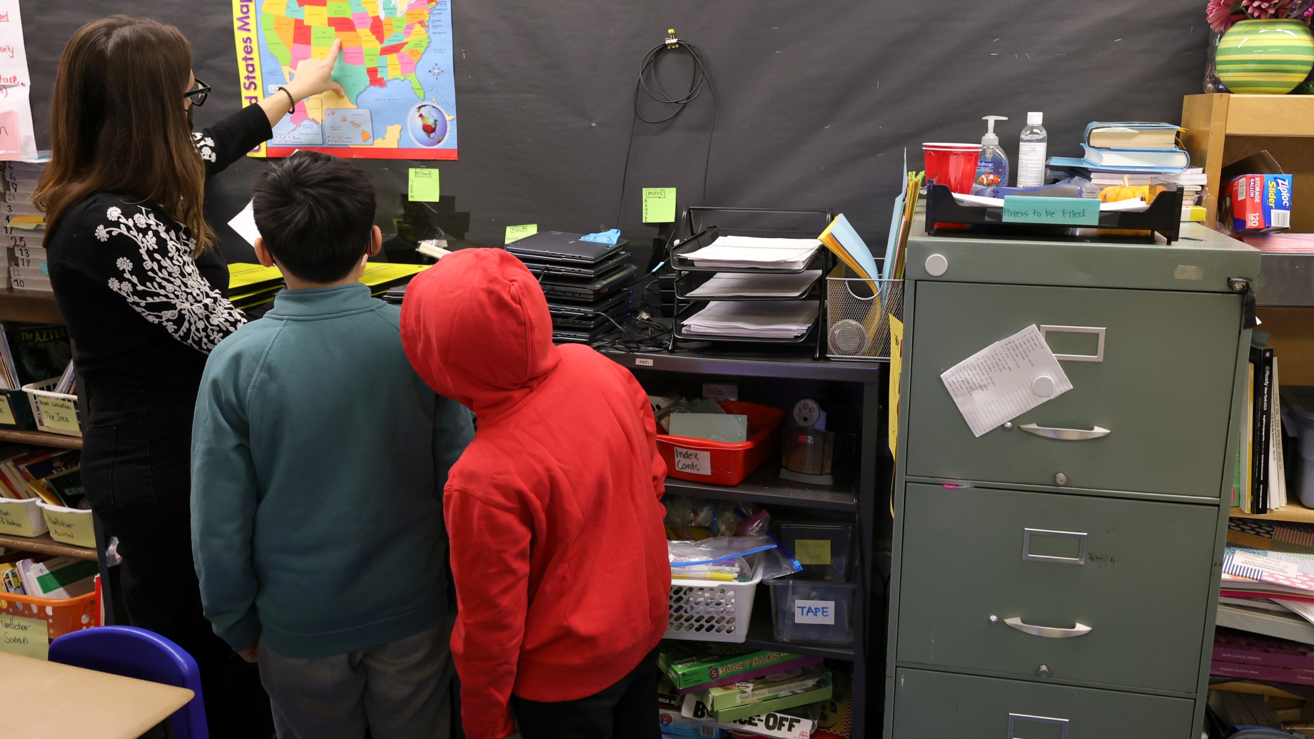 NEW YORK, NEW YORK – JANUARY 05: A masked teacher who wished not be identified (L), gives students a lesson in her classroom at Yung Wing School P.S. 124 on January 05, 2022 in New York City. Mayor Eric Adams of New York City is keeping classrooms open for in-person lessons despite prolific student and teacher absences due to the surge in Omicron cases. (Photo by Michael Loccisano/Getty Images)