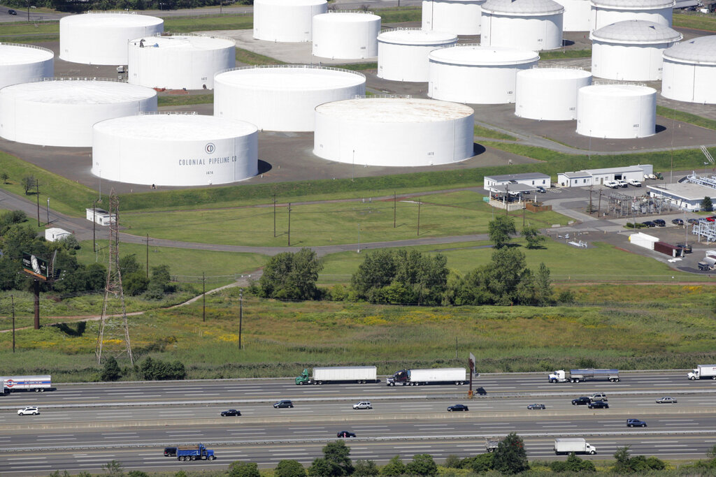 Traffic on I-95 passes oil storage tanks owned by the Colonial Pipeline Company in Linden, N.J. A major pipeline that transports fuels along the East Coast says it had to stop operations because it was the victim of a cyberattack. Colonial Pipeline said in a statement late Friday that it “took certain systems offline to contain the threat, which has temporarily halted all pipeline operations, and affected some of our IT systems.” (AP Photo/Mark Lennihan, File)