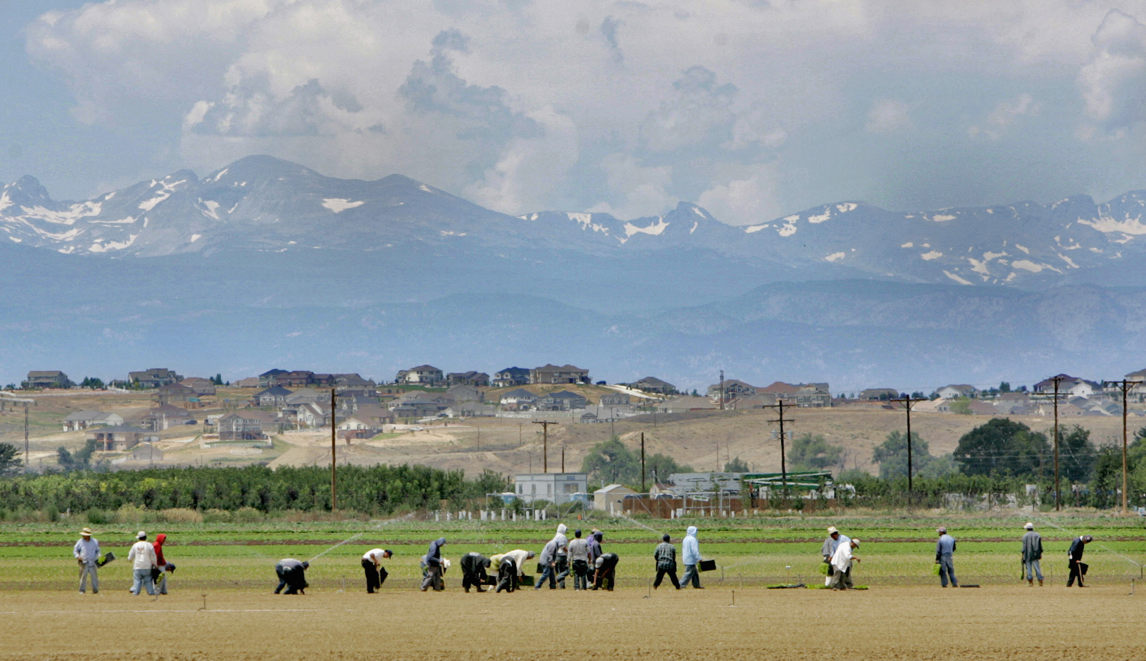 FILE – Laborers plant a crop on a farm northeast of Denver near Brighton, Colo., northeast of Denver near Brighton, Colo., in this, July 11, 2006, file photo. (AP Photo/Ed Andrieski)
