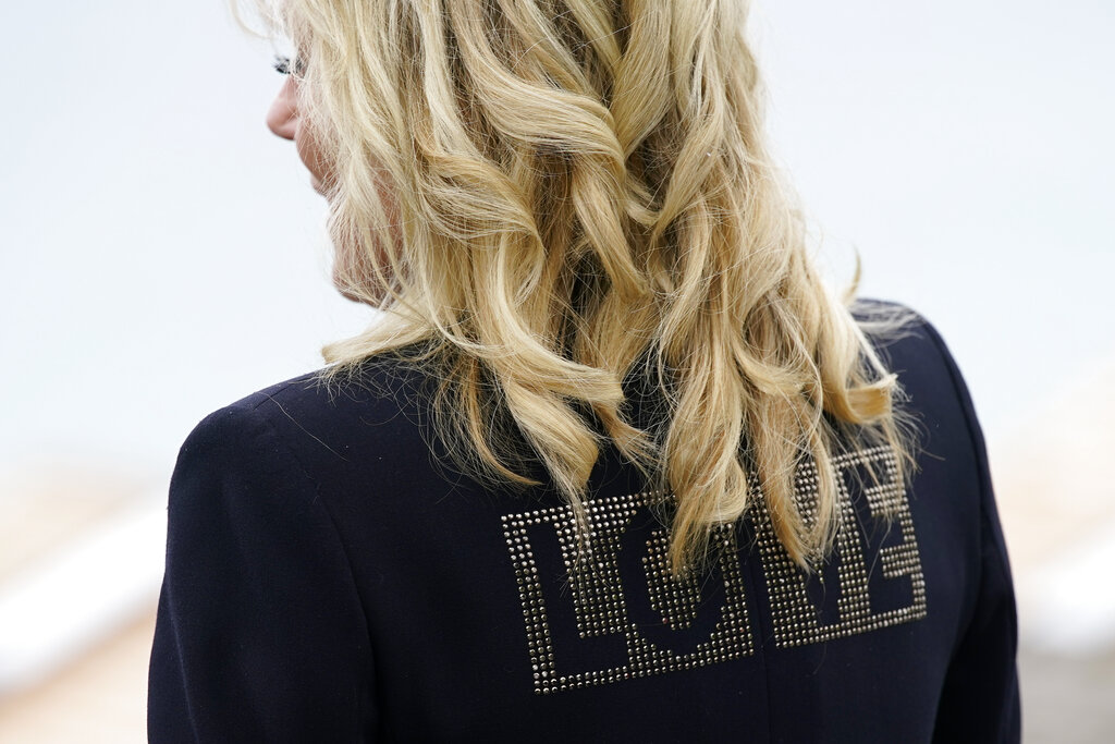 The first lady wore a black jacket with the word “love” outlined on the back in silver beading as she and the president met with British Prime Minister Boris Johnson and his wife Thursday. She wore the same jacket more than two years ago to kick off Biden’s presidential campaign.