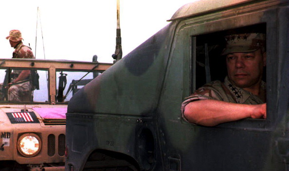 U.S. General Colin Powell, on a 24 hours visit in Somalia, leaves the military airport in an armoured car 04 April 1993. (Photo credit should read ERIC CABANIS/AFP/GettyImages)