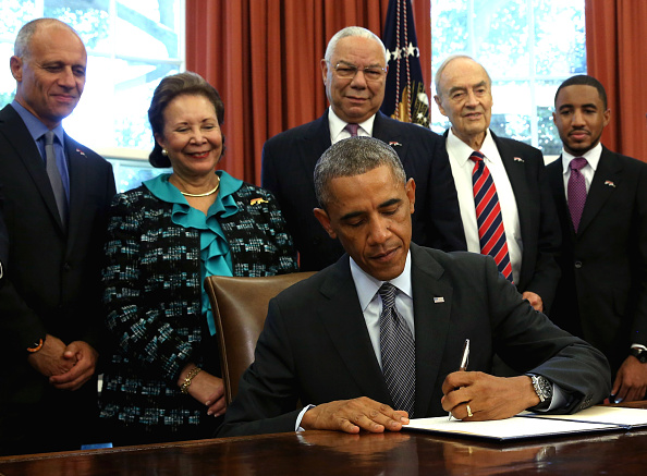 WASHINGTON, DC – SEPTEMBER 22: U.S. President Barack Obama (C) signs America’s Promise Summit Declaration which calls on all people “to help the youth of America reach their full potential,” at the White House September 22, 2014, in Washington, DC. Also pictured are President and CEO of America’s Promise Alliance John Gomberts (L), Chair of America’s Promise Alliance Alma Powell (2ndL), Former Secretary of State Colin Powell (3rd L), Former US Senator Harris Wofford (2nd R), and Special Project Assistant to the President at Be the Change, Deon Jones (R). (Photo by Mark Wilson/Getty Images)