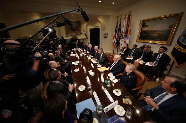 WASHINGTON, DC – NOVEMBER 13: U.S. President Barack Obama delivers remarks following a meeting with present and former national security leaders in the Roosevelt Room of the White House November 13, 2015 in Washington, DC. Obama met with the national security leaders on the national security implications of the Trans Pacific Partnership trade pact. Joining Obama at the meeting were Madeleine Albright, former Secretary of State; James Baker, former Secretary of State; Bill Cohen, Former Secretary of Defense; Stephen Hadley, Former National Security Advisor; James Jones, General, Former National Security Advisor; Henry Kissinger, Former Secretary of State; Samuel Locklear, Admiral, Commander, U.S. Pacific Command; Mike Mullen, Admiral, Former Chairman of the Joint Chiefs; Colin Powell, General, Former Secretary of State, Chairman of the Joint Chiefs and National Security Advisor; Brent Scowcroft, Former National Security Advisor; James Winnefeld, Admiral, Former Vice Chairman of the Joint Chiefs of Staff; Vice President Joe Biden; Ash Carter, Secretary of Defense; Mike Froman, United States Trade Representative; Valerie Jarrett, Senior Advisor and Assistant to the President for Intergovernmental Affairs and Public Engagement; Susan Rice, Assistant to the President for National Security Affairs; and Jeff Zients, Assistant to the President for Economic Policy and Director of the National Economic Council. (Photo by Win McNamee/Getty Images)