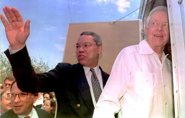 PORT-AU-PRINCE, HAITI: Former US President Jimmy Carter (R), former Chairman of the Joint Chiefs of Staff Gen. Colin Powell (C) and Sen. Sam Nunn arrive 24 February at the headquarters of the Multinational Force stationed in Port-au-Prince. Carter heads a delagation meeting with Haitian election officials about the upcoming legislative and local elections. (COLOR KEY: Sky is blue.) AFP PHOTO (Photo credit should read THONY BELIZAIRE/AFP via Getty Images)