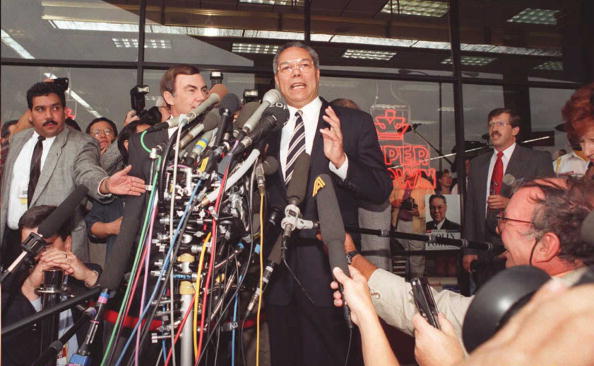 MCLEAN, VA – SEPTEMBER 16: Colin Powell speaks to the press on the first day of his tour 16 September at the Crown Books store in McLean, Virginia to promote his new book “My American Journey”. Powell would not give an answer when asked by reporters if he would consider running in the 1996 Presidential elections. AFP PHOTO (Photo credit should read JOYCE NALTCHAYAN/AFP via Getty Images)