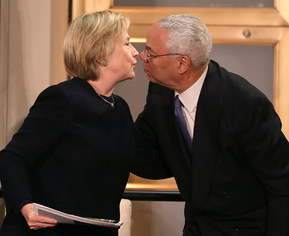 WASHINGTON, DC – JANUARY 10: Former Secretary of State, Colin Powell (R), stands up to kiss former Secretary of State Hillary Clinton after she spoke at a reception celebrating the completion of the U.S. Diplomacy Center Pavilion, at the State Department on January 10, 2017 in Washington, DC. The first floor of the pavilion was dedicated and named the Hillary Rodham Clinton Pavilion. (Photo by Mark Wilson/Getty Images)