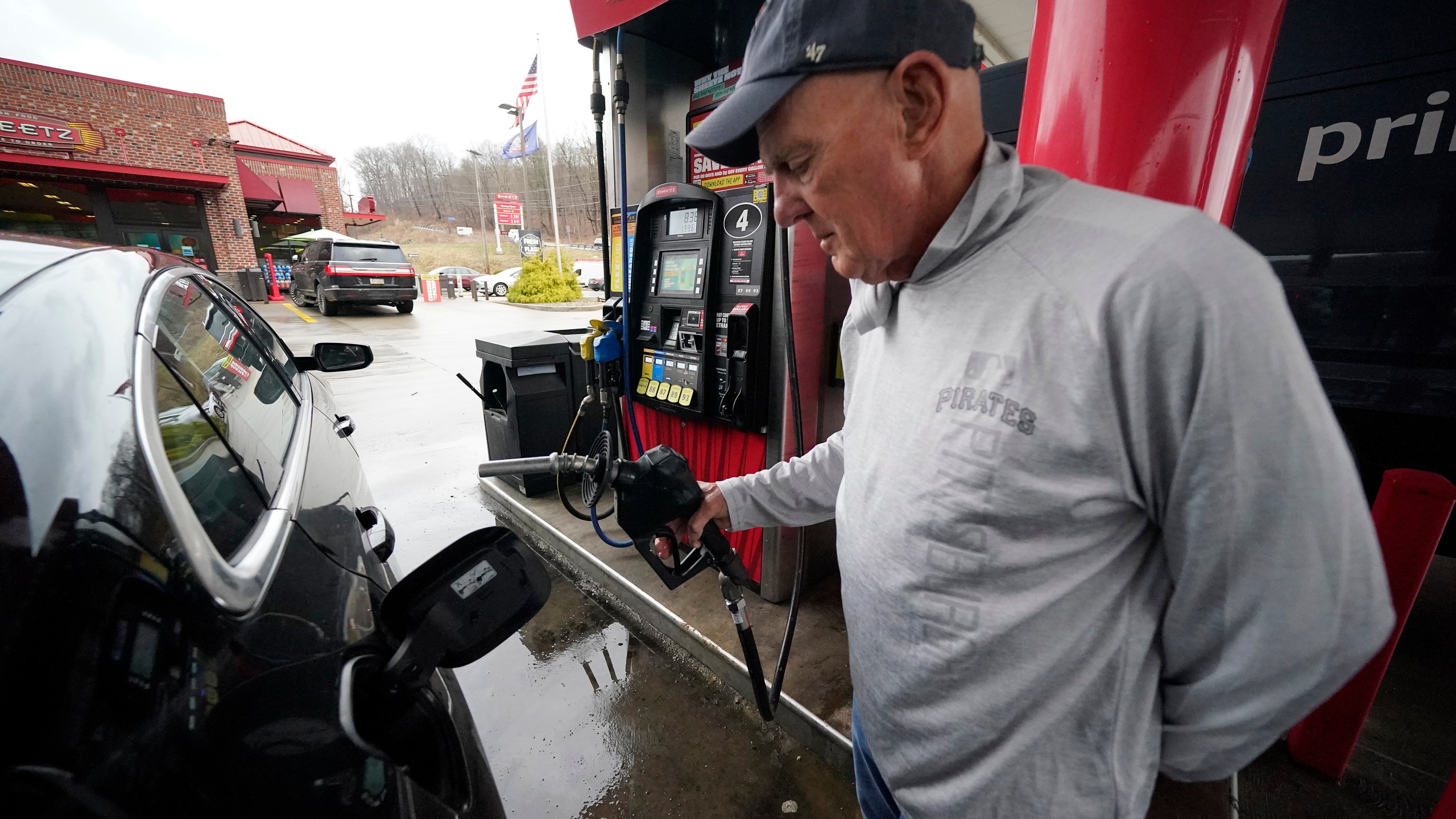 Darryl Matevish, of Sewickley, Pa., fills his car with regular unleaded gas at $4.19.9 per gallon at a Sheetz store in Sewickley, Pa., Monday, March 7, 2022. (AP Photo/Gene J. Puskar)