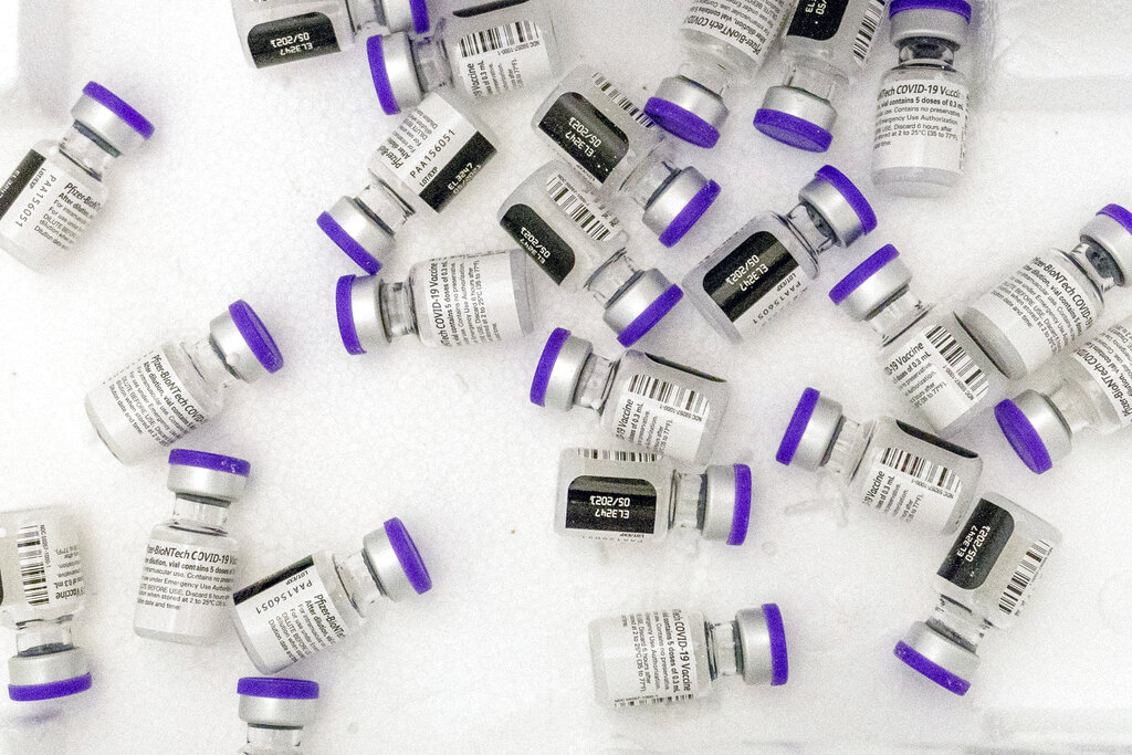 FILE – Vials of the Pfizer-BioNTech COVID-19 vaccine sit in a cooler before being thawed at a pop-up COVID-19 vaccination site in the Bronx borough of New York on Tuesday, Jan. 26, 2021. On Tuesday, Nov. 9, 2021, Pfizer asked U.S. regulators to allow boosters of its COVID-19 vaccine for anyone 18 or older, a step that comes amid concern about increased spread of the coronavirus with holiday travel and gatherings. (AP Photo/Mary Altaffer, File)