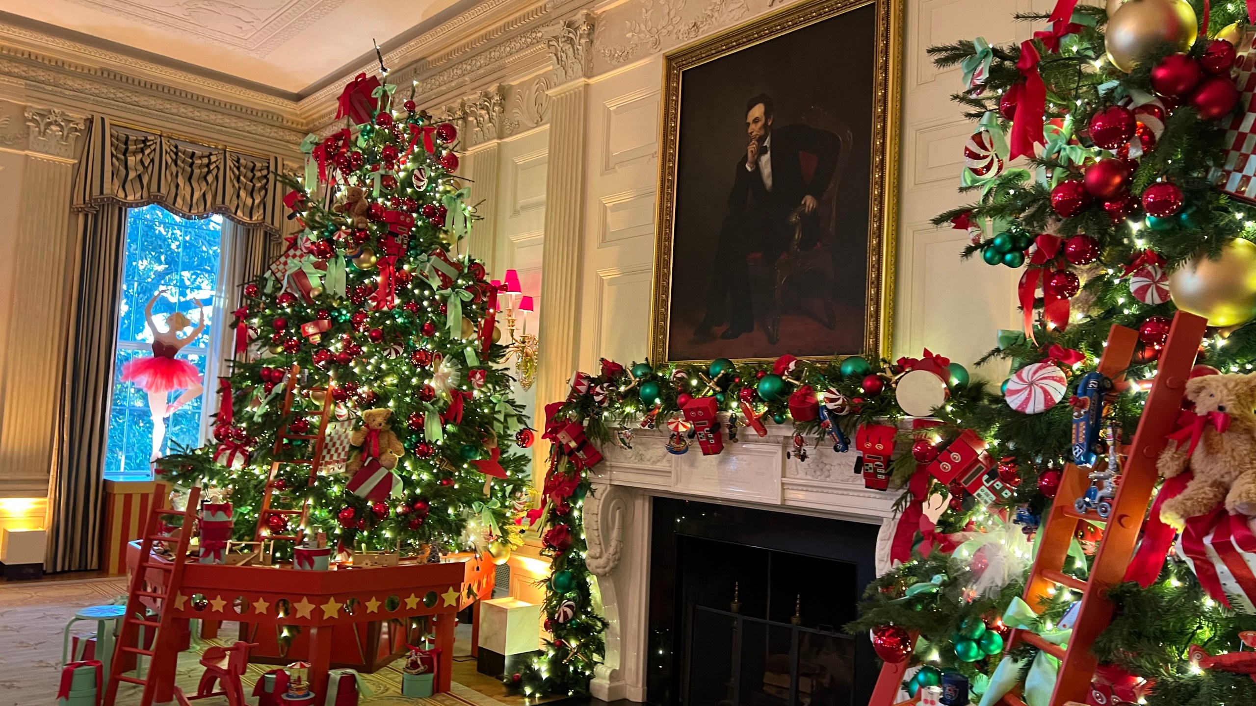 The official White House Christmas tree is showcased in the Blue Room. This year’s tree is an 18.5-foot Fraser Fir from Fleetwood, North Carolina, with names of every state, territory and the District of Columbia listed on individual ornaments. A vintage passenger train weaves around its base.