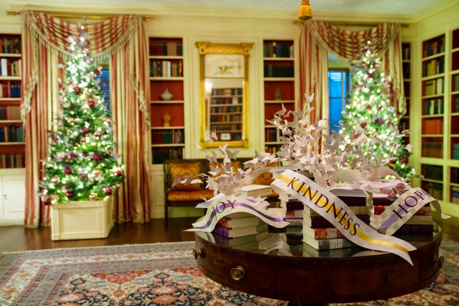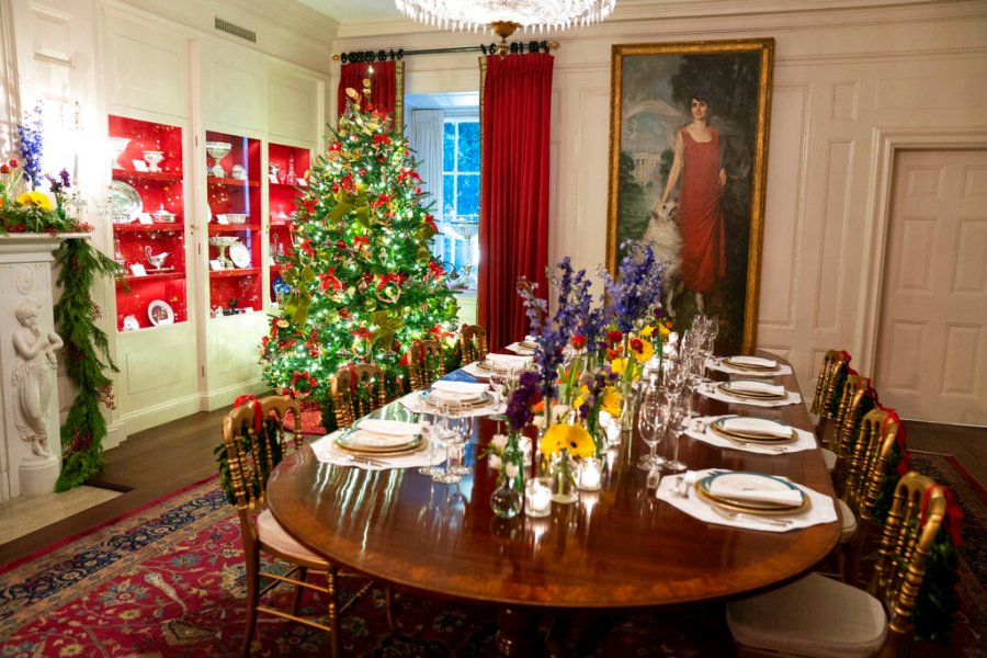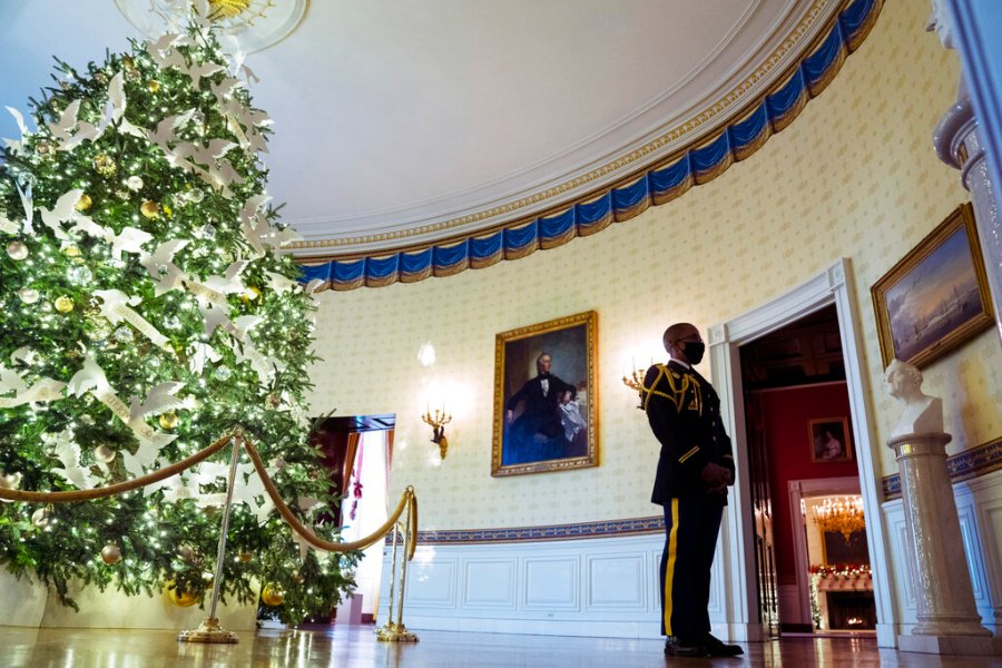 The official White House Christmas tree, always set up in the Blue Room, is decorated with peace doves carrying a banner embossed with the names of the 50 states and the U.S. territories. Jill Biden tweeted a photo of the tree early Monday.