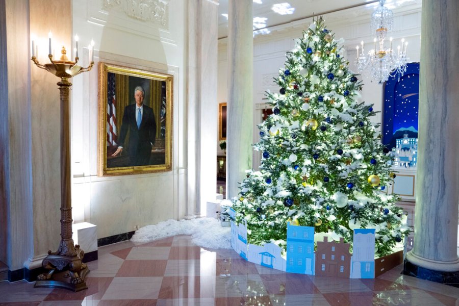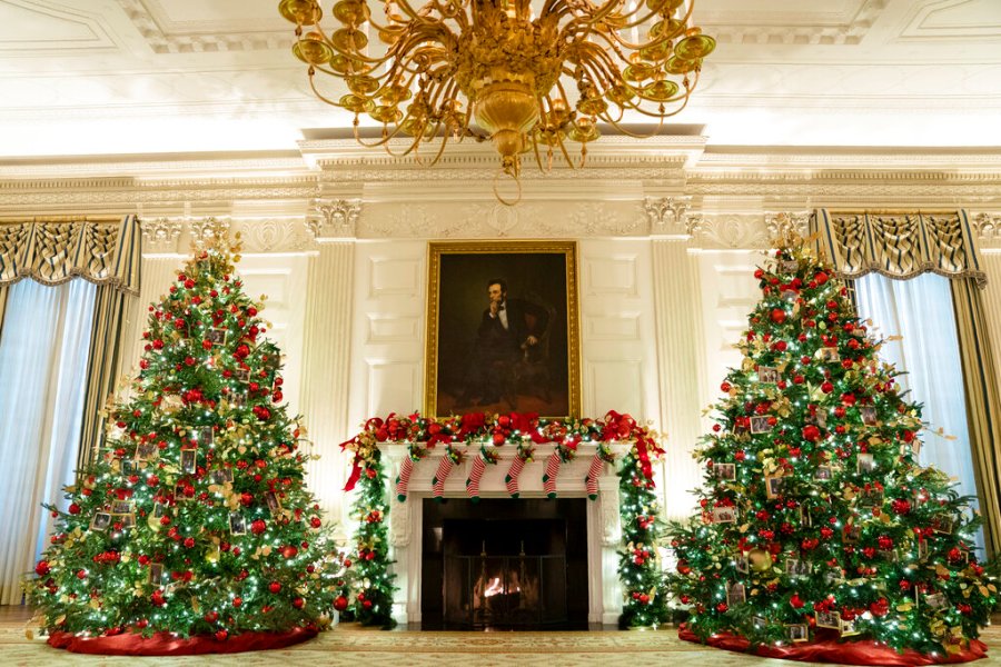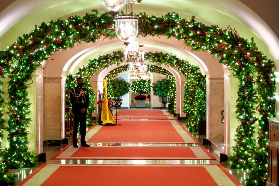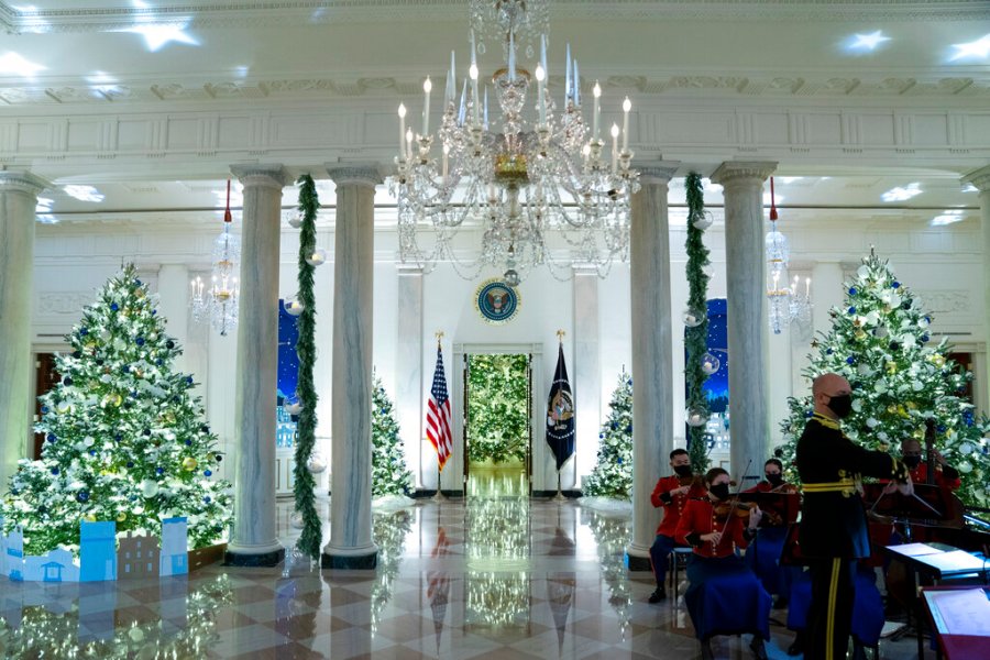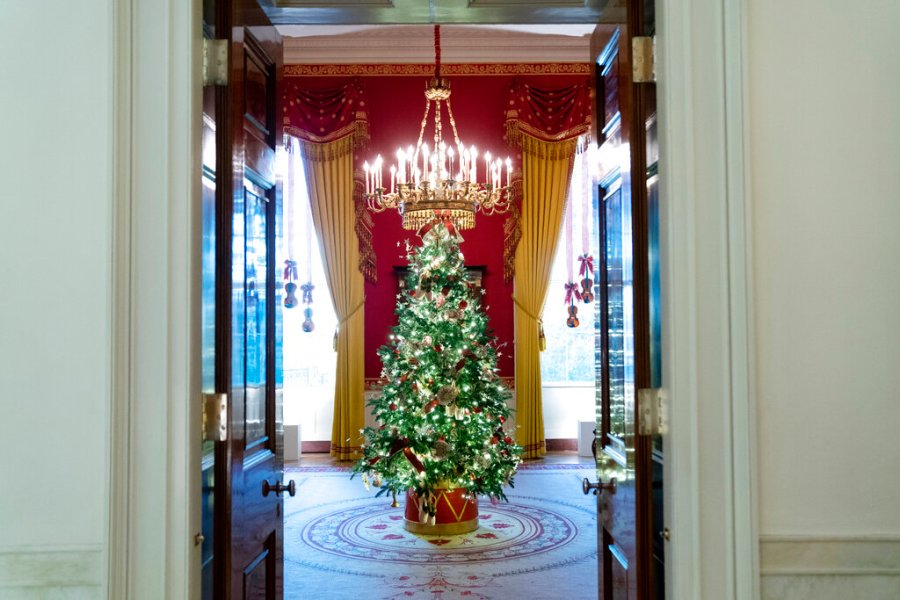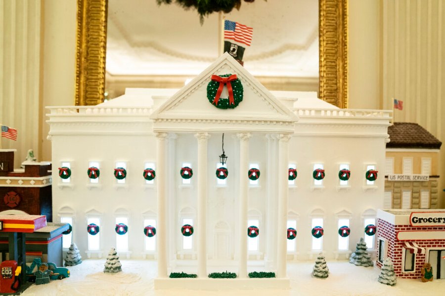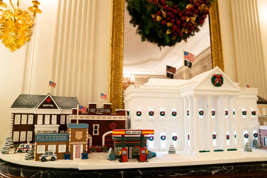 The decor features a gigantic gingerbread White House that recognizes front-line workers who persevered through the coronavirus pandemic, while the official Christmas tree — an 18-foot-tall (5.5-meter tall) Fraser fir — celebrates the gifts of peace and unity, the White House said.