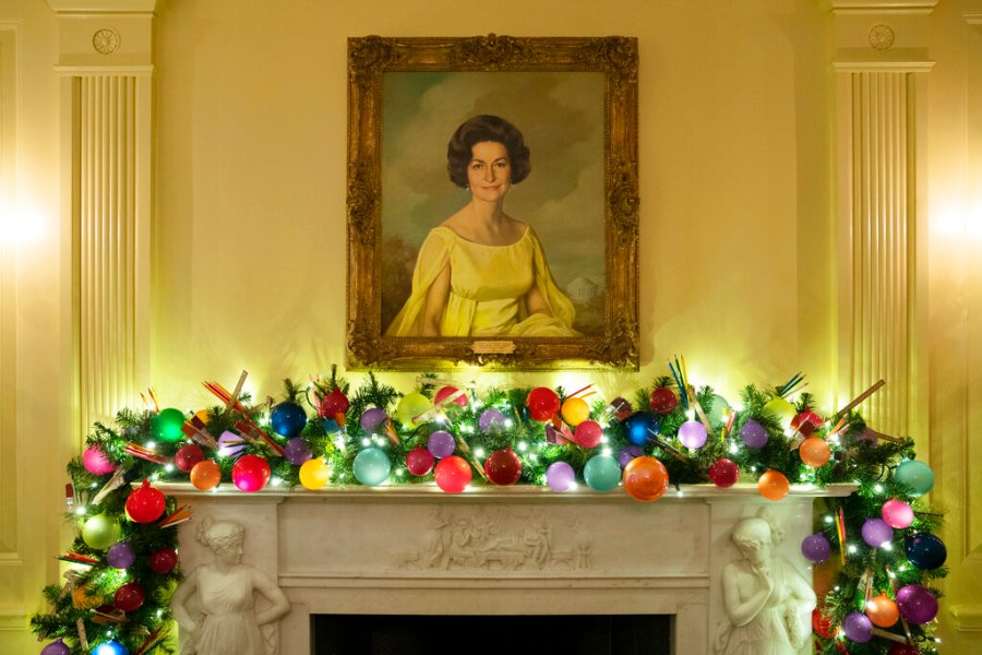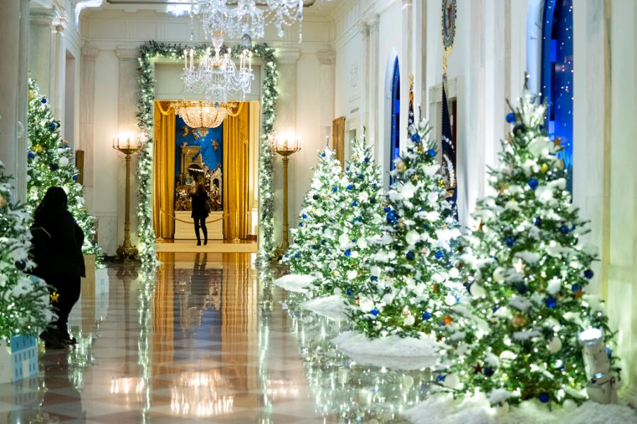 With the Bidens spending Thanksgiving week in Nantucket, Massachusetts, more than 100 volunteers set about decorating the executive mansion — including the Oval Office — with 41 Christmas trees, some 6,000 feet (2,000 yards) of ribbon and more than 10,000 ornaments.