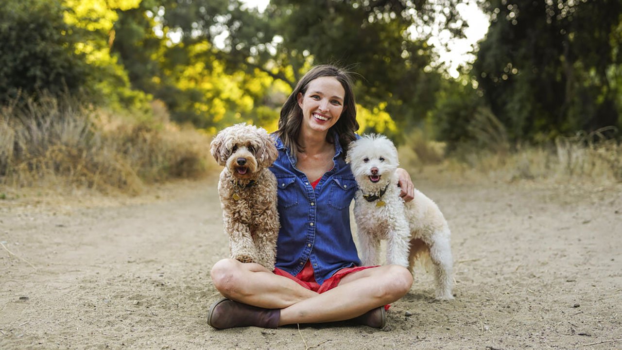 This photo shows Nicole Ellis, a certified professional dog trainer for Rover.com, in a park with her dogs in Simi Valley, California, in August 2020. Ellis suggests packing puzzles, lick mats and other enrichment toys for dogs staying over in a new home for the holidays. (Anabel DFlux via AP)