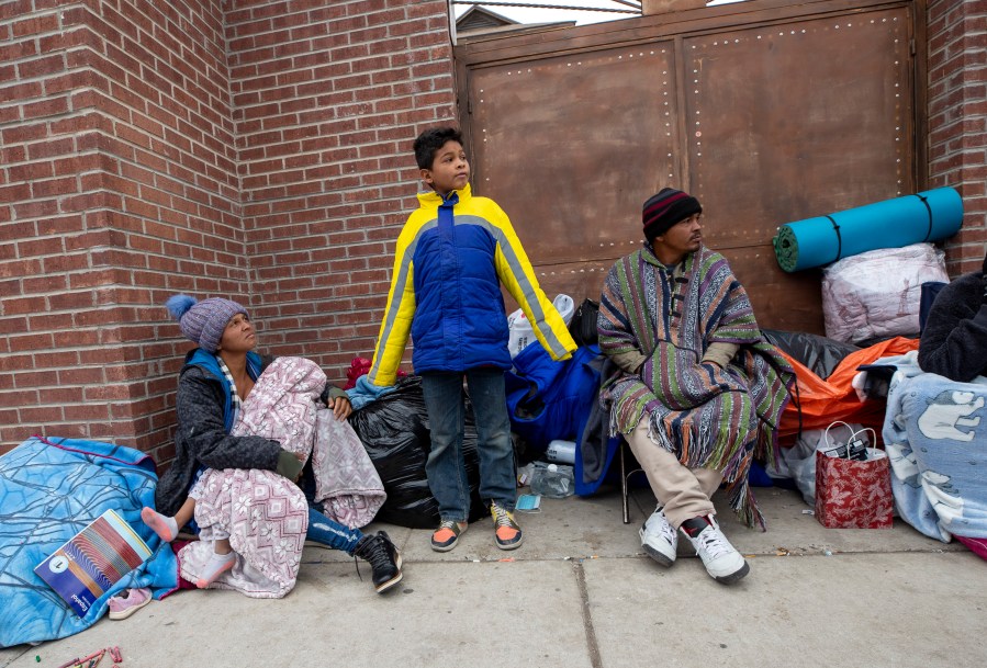 Castillo was among a group of about 30 migrants who gathered for prayers Sunday morning outside the Sacred Heart Catholic Church where many of the newcomers have been camping.