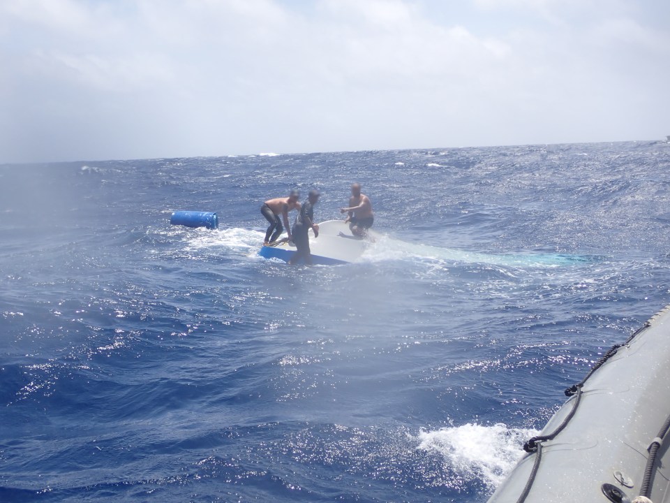 Suspected drug smugglers standing on top of a sinking vessel approximately 90 miles south of Haiti on July 24, 2024. The USS St. Louis launched a small boat crew to rescue the suspected smugglers after their vessel capsized. (Courtesy photo)