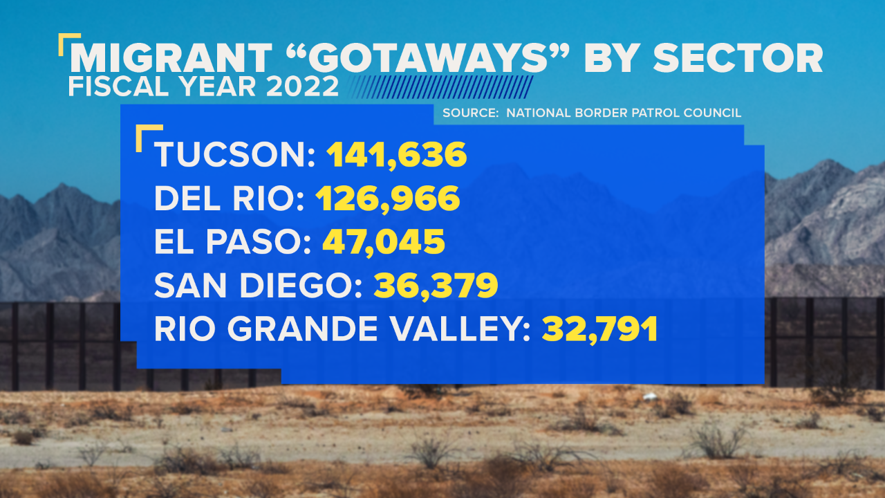 The number that has many in law enforcement most concerned is the number of “known gotaways” — or the number of migrants who have eluded law enforcement, which tops 445,000 this fiscal year, with the Tucson, Arizona, and Del Rio, Texas, sectors leading the way.