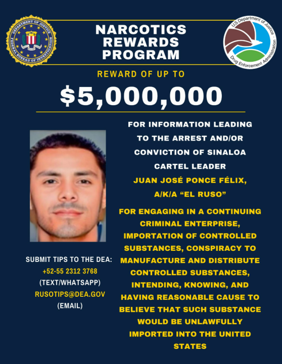 Per the FBI, Juan José Ponce Félix, also known as “Jesús Alexandro Sanchez Félix” and “El Ruso,” is the founder and leader of Los Rusos, the main wing of La Mayiza, a powerful faction of the Sinaloa cartel.