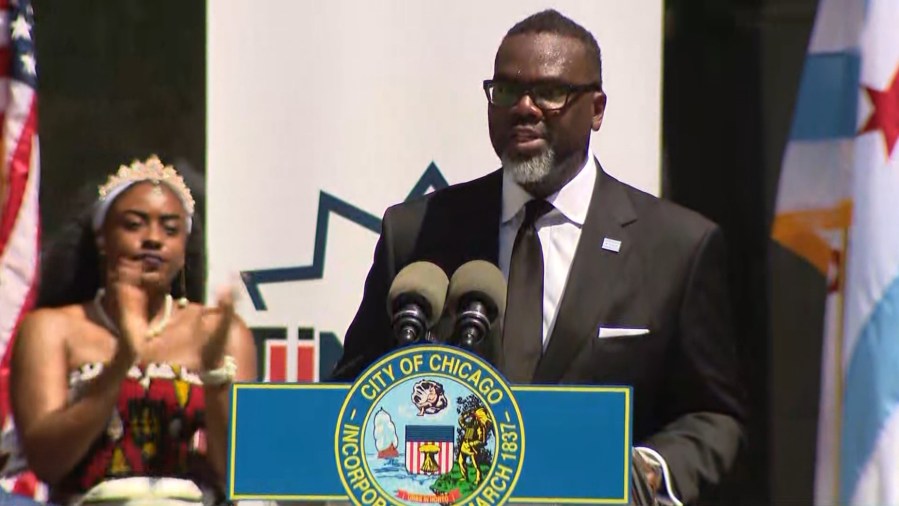 Chicago Mayor Brandon Johnson touted the creation of the Reparations Task Force to develop a Black Reparations Agenda at a city ceremony to raise the Juneteenth flag on June 17, 2024.