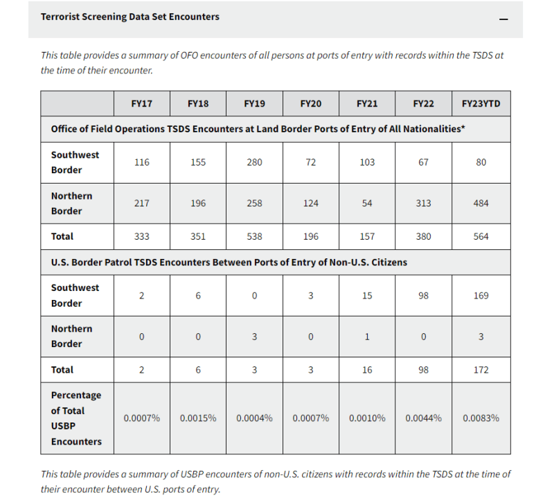 “Encounters of watchlisted individuals at our borders are very uncommon, underscoring the critical work CBP Agents and Officers carry out every day on the frontlines. DHS works tirelessly to secure our borders through a combination of highly trained personnel, ground and aerial monitoring systems, and robust intelligence and information sharing networks,” the website reads about the dataset.