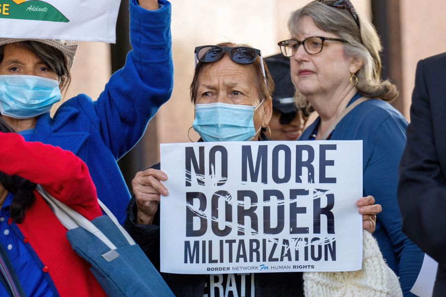Texas border and immigrant advocates, community members, and civil rights organizations protest against immigration bills outside of the John H. Reagan State Office Building in Austin, Texas, on April 12, 2023. – Bills proposed in the Texas legislature are seeking to shift border patrol from federal to state government control. House Bill 20 aims to create “Border Protection Units” comprised of police and “law abiding citizens” who would be granted the ability to use non-lethal force to arrest, detain, and deter individuals crossing the border illegally. (Photo by SUZANNE CORDEIRO / AFP) (Photo by SUZANNE CORDEIRO/AFP via Getty Images)