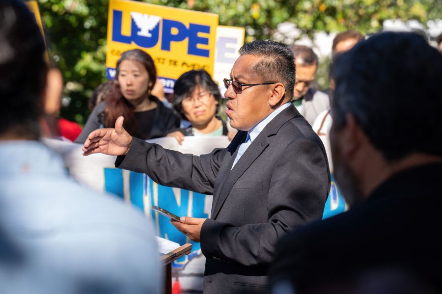 Texas Representative Gene Wu speaks to border and immigrant advocates, community members, and civil rights organizations protesting against immigration bills outside of the John H. Reagan State Office Building in Austin, Texas, on April 12, 2023. – Bills proposed in the Texas legislature are seeking to shift border patrol from federal to state government control. House Bill 20 aims to create “Border Protection Units” comprised of police and “law abiding citizens” who would be granted the ability to use non-lethal force to arrest, detain, and deter individuals crossing the border illegally. (Photo by SUZANNE CORDEIRO / AFP) (Photo by SUZANNE CORDEIRO/AFP via Getty Images)