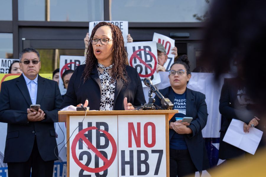 Samantha Singleton, Policy Director of Border Network for Human Rights, speaks to border and immigrant advocates, community members, and civil rights organizations protesting against immigration bills outside of the John H. Reagan State Office Building in Austin, Texas, on April 12, 2023. – Bills proposed in the Texas legislature are seeking to shift border patrol from federal to state government control. House Bill 20 aims to create “Border Protection Units” comprised of police and “law abiding citizens” who would be granted the ability to use non-lethal force to arrest, detain, and deter individuals crossing the border illegally. (Photo by SUZANNE CORDEIRO / AFP) (Photo by SUZANNE CORDEIRO/AFP via Getty Images)