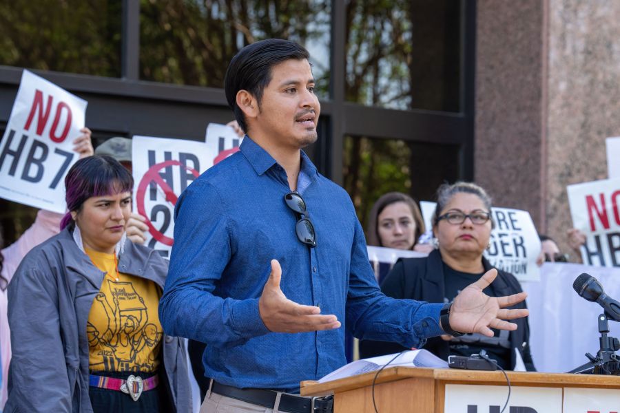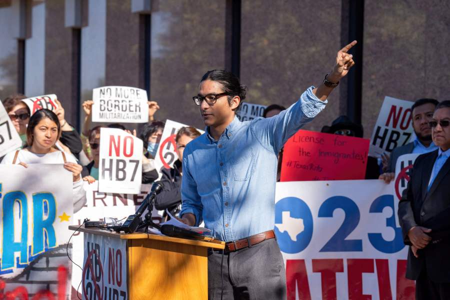 Roberto Lopez of the Texas Civic Rights Project speaks to border and immigrant advocates, community members, and civil rights organizations protesting against immigration bills outside of the John H. Reagan State Office Building in Austin, Texas, on April 12, 2023. – Bills proposed in the Texas legislature are seeking to shift border patrol from federal to state government control. House Bill 20 aims to create “Border Protection Units” comprised of police and “law abiding citizens” who would be granted the ability to use non-lethal force to arrest, detain, and deter individuals crossing the border illegally. (Photo by SUZANNE CORDEIRO / AFP) (Photo by SUZANNE CORDEIRO/AFP via Getty Images)